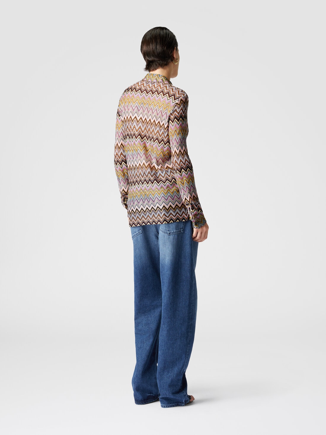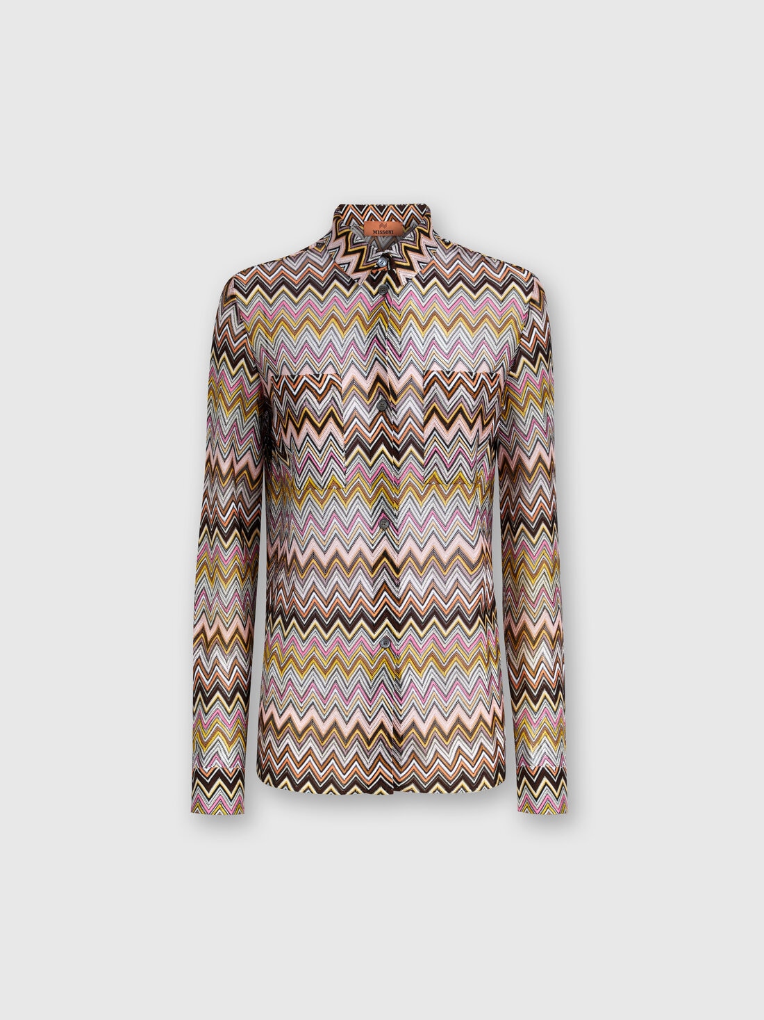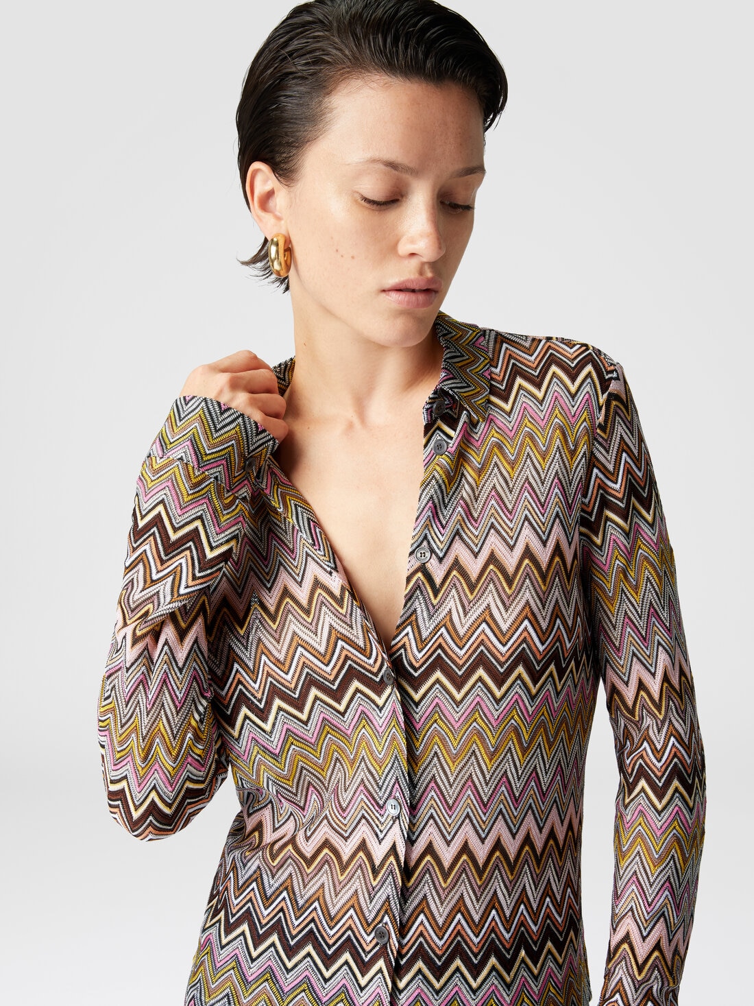 Un motivo zig zag deciso, che gioca con il colore e la lavorazione raschel a rilievo, per la camicia con tasche a toppa. Realizzata in pura viscosa, questa blusa saprà aggiungere un tocco di elegante brio a ogni look.