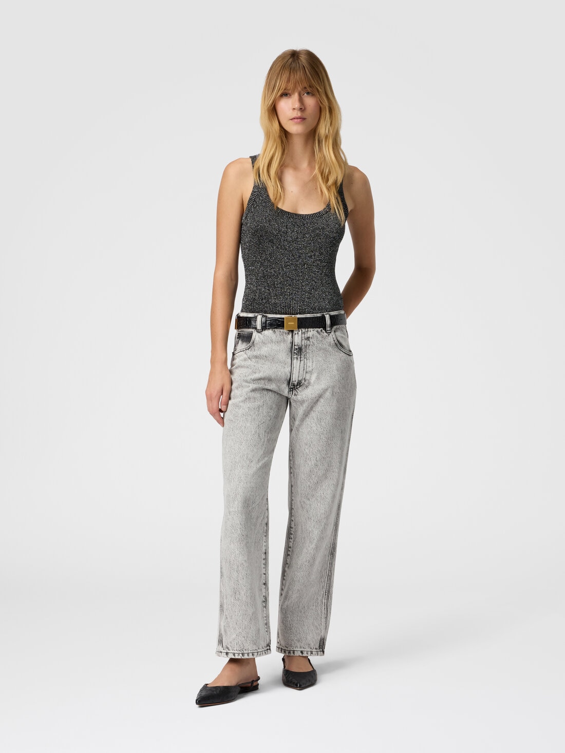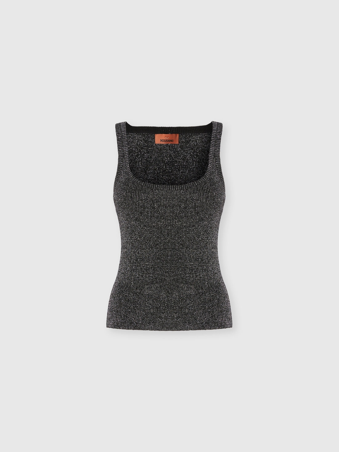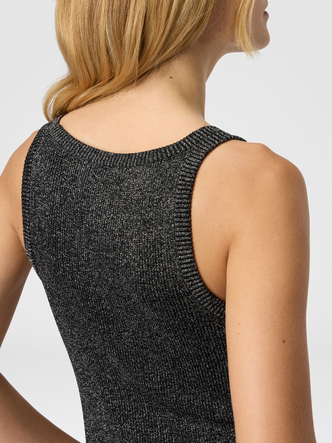 Una canotta essenziale da donna ma ricercata, realizzata in misto viscosa e lamé con una preziosa lavorazione vanisè. La scollatura tonda valorizza la linea pulita del capo, mentre i riflessi metallici ne esaltano la texture con discreta eleganza.