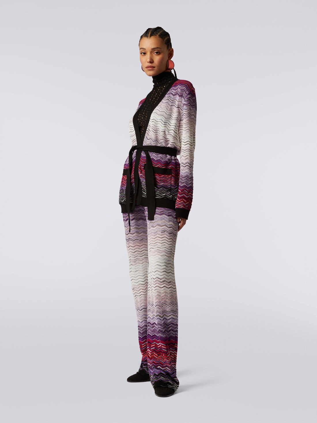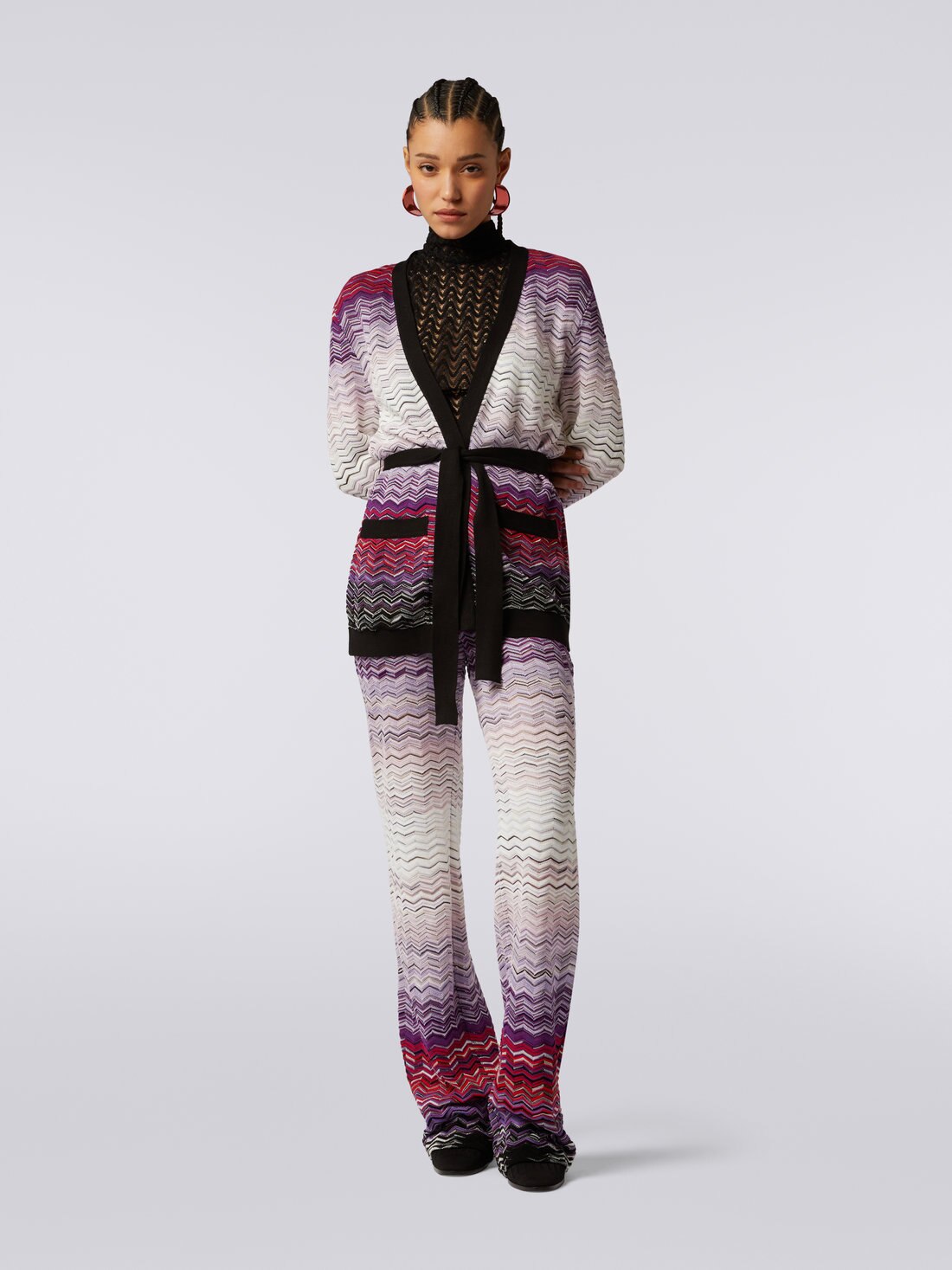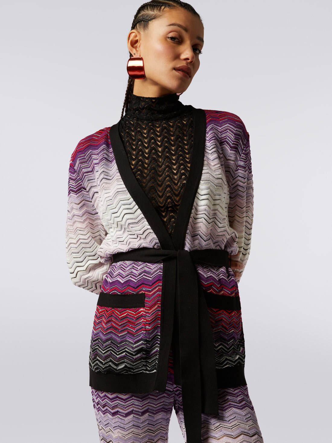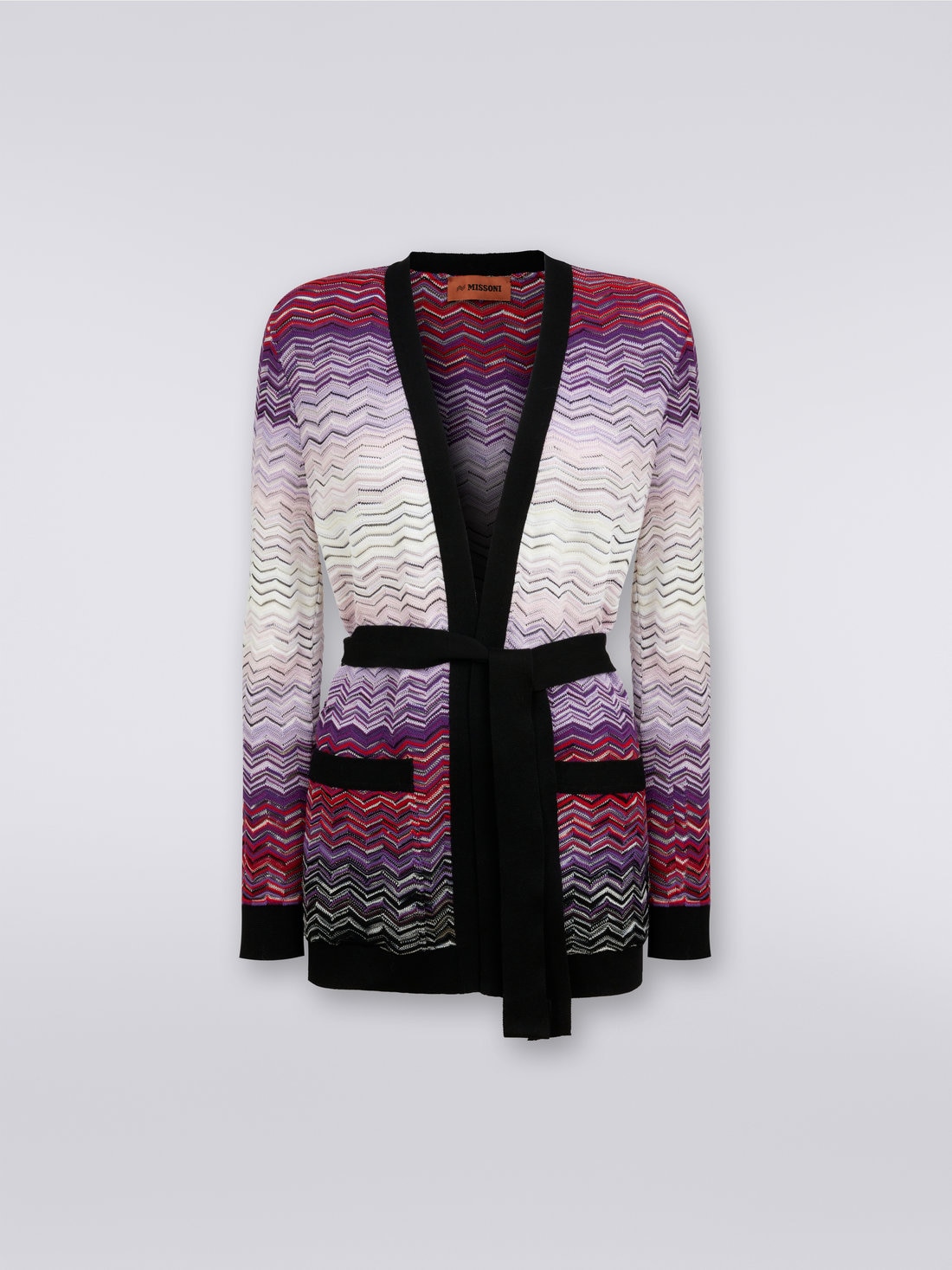 La maestria di Missoni, inimitabile nella lavorazione della maglia, fa di questo cardigan da donna un capo ultra-femminile e squisitamente chic. Il modello, con cintura e tasche, è animato dal motivo zig zag dégradé che ne sottolinea il design.