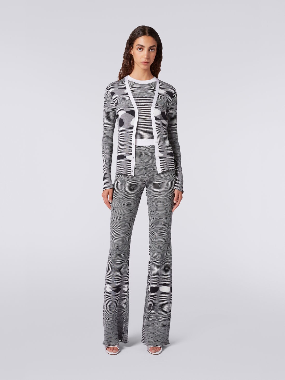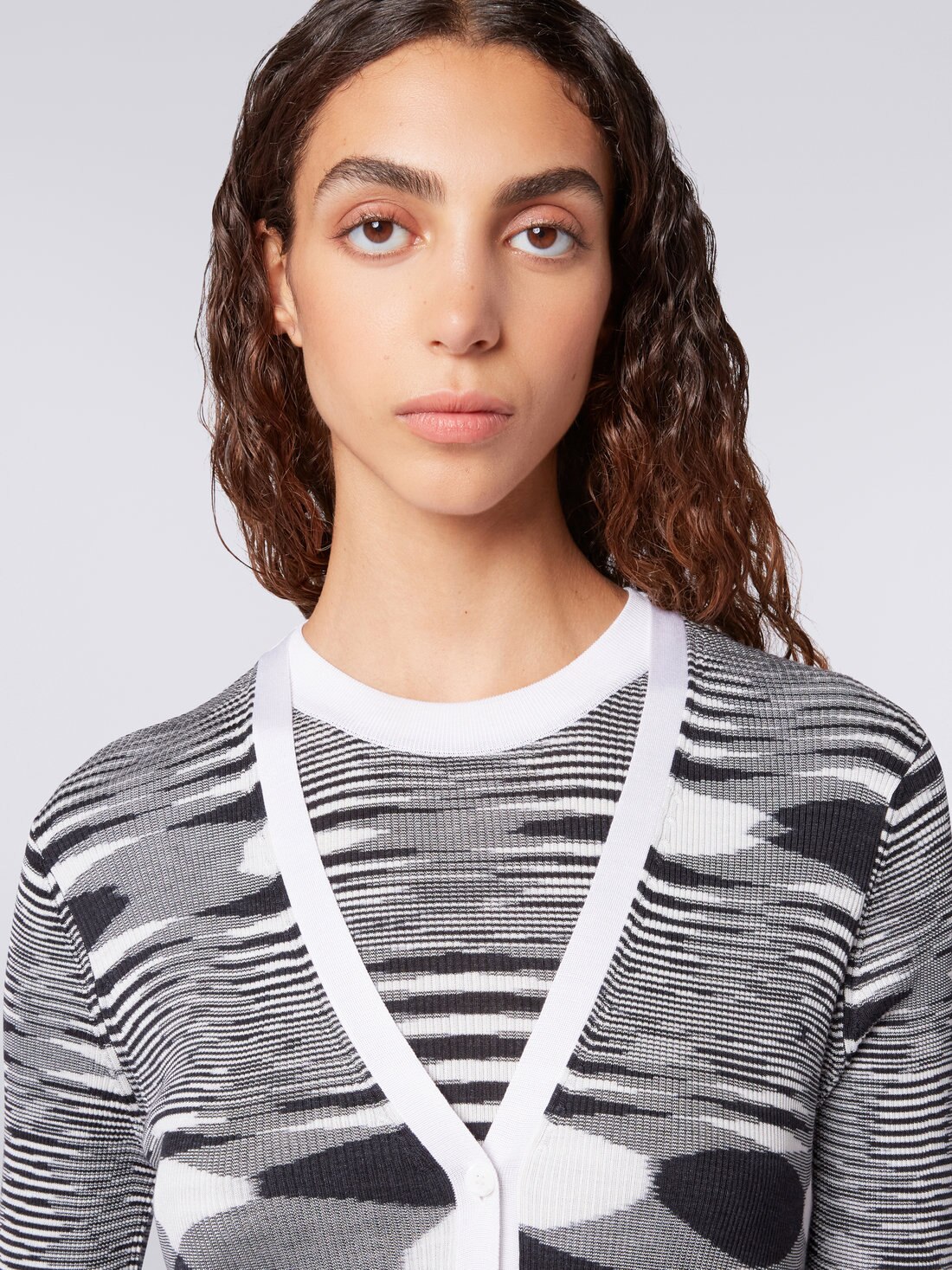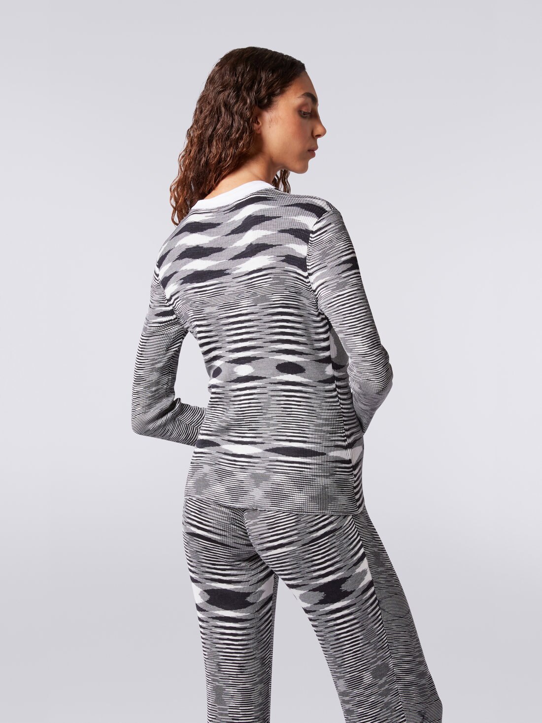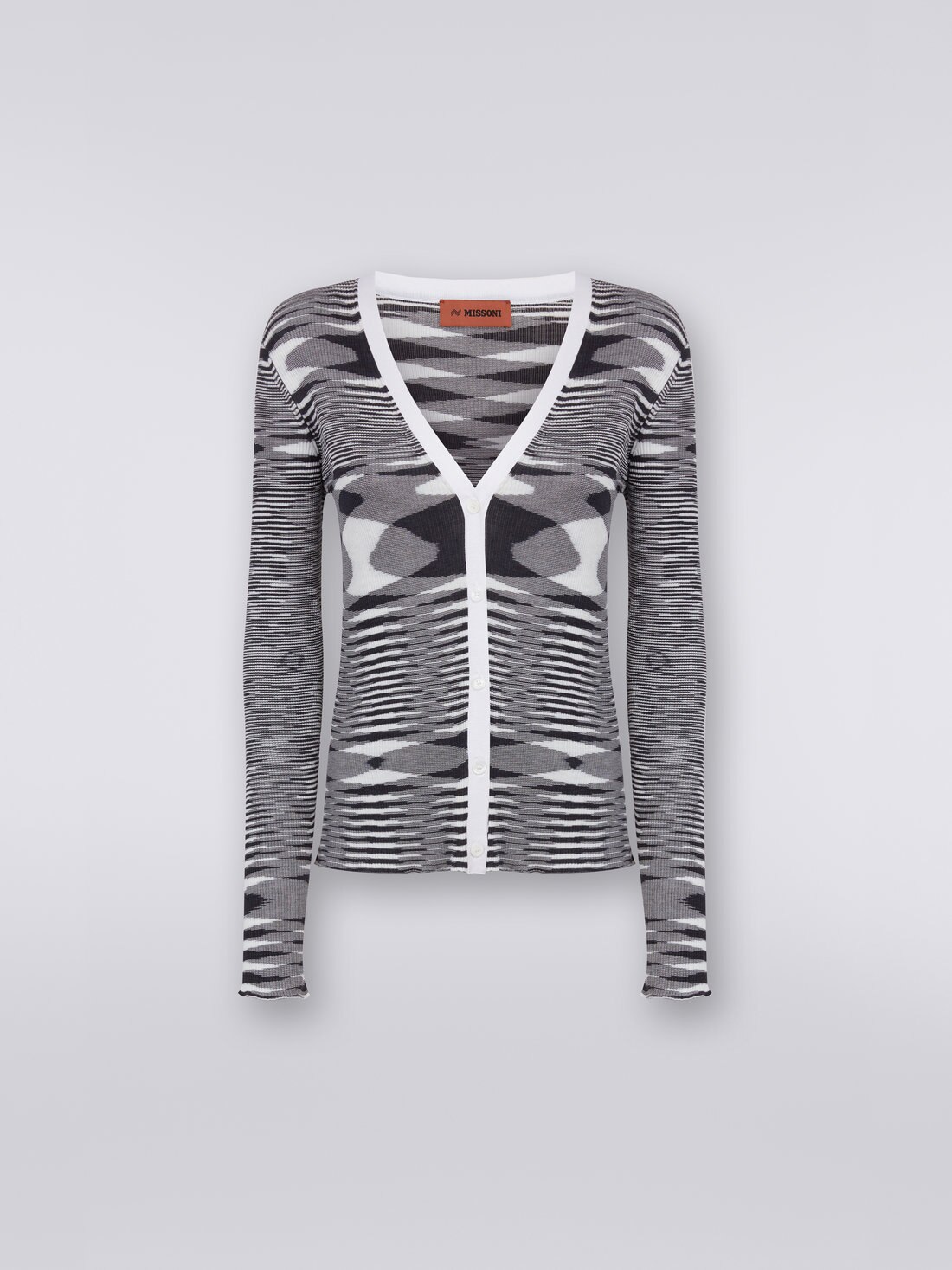 Tutta la raffinatezza della maglia di pura seta per il cardigan da donna fiammato bicolore con profilo a tinta unita. Un capo in cui emerge con esemplare chiarezza l'arte della maglieria di Missoni e l'inconfondibile DNA del brand.