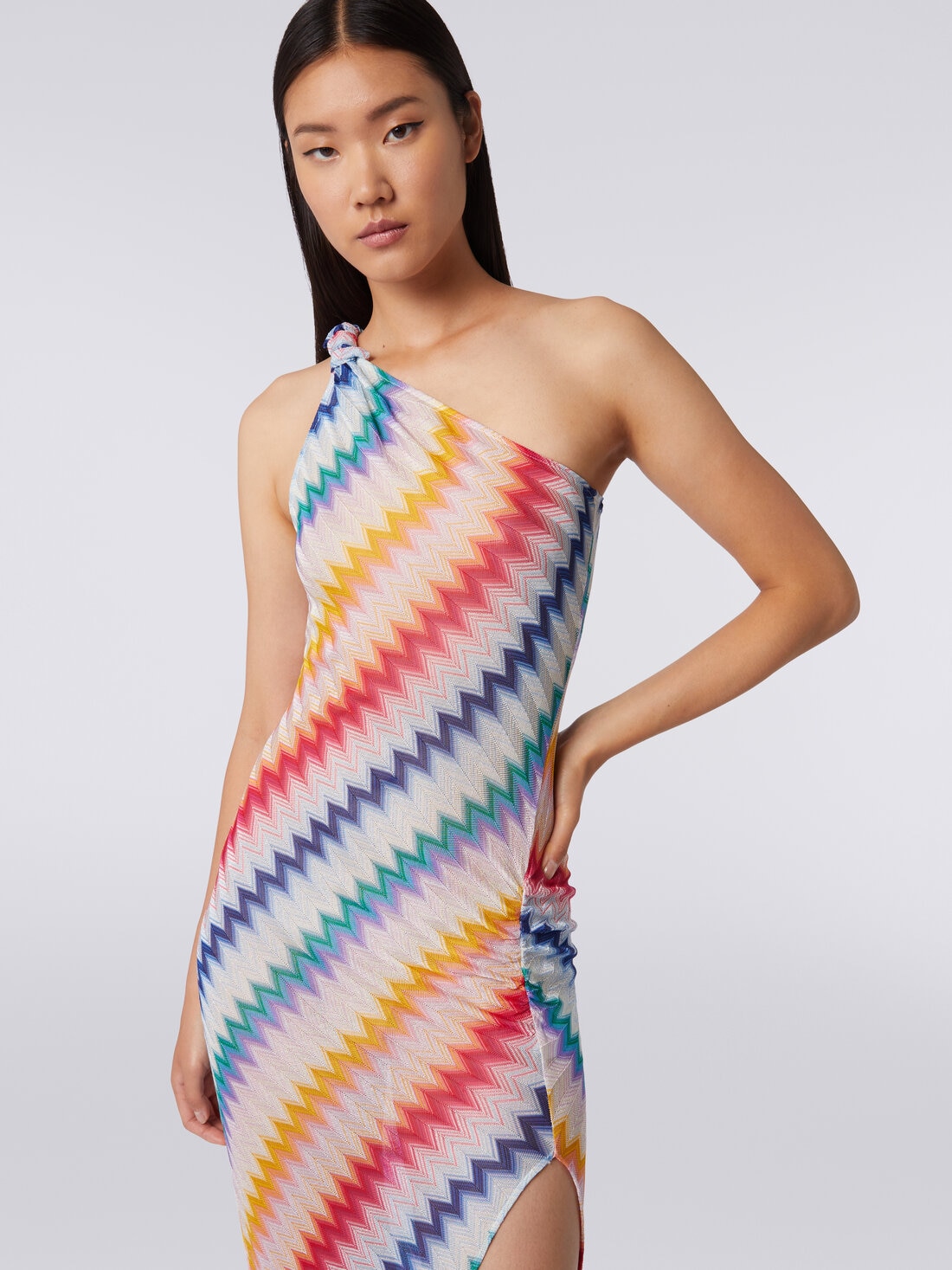 Una singola spallina goffrata sostiene l'abito monospalla lungo da donna. Un sensuale spacco laterale caratterizza il modello realizzato in leggera magia di viscosa, con motivo zig zag sfumato e il brillante tocco del lurex.