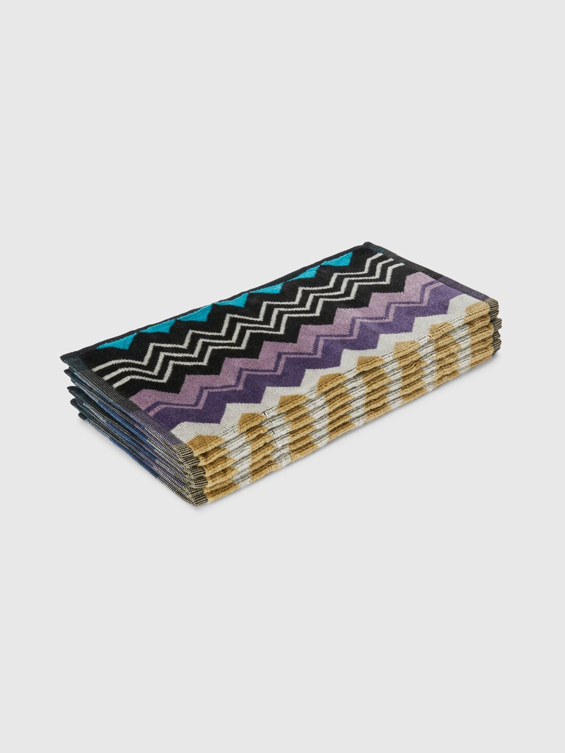 La firma distintiva di MissoniHome si riflette nel set di lavette Giacomo, composto da sei pezzi. La tela di puro cotone, impreziosita dal motivo zig zag, conferisce a questo accessorio un'eleganza discreta e raffinata, al servizio degli ospiti.