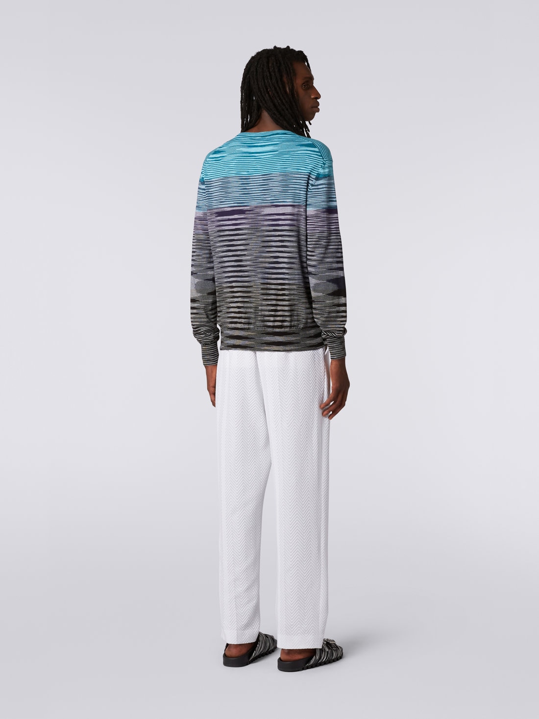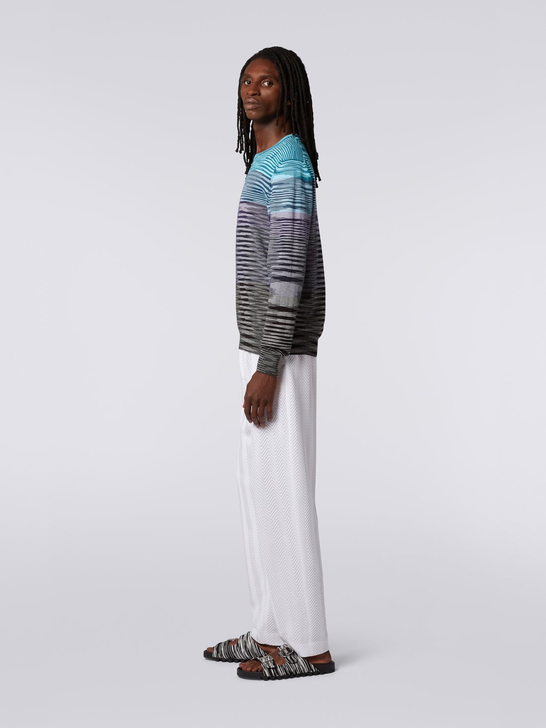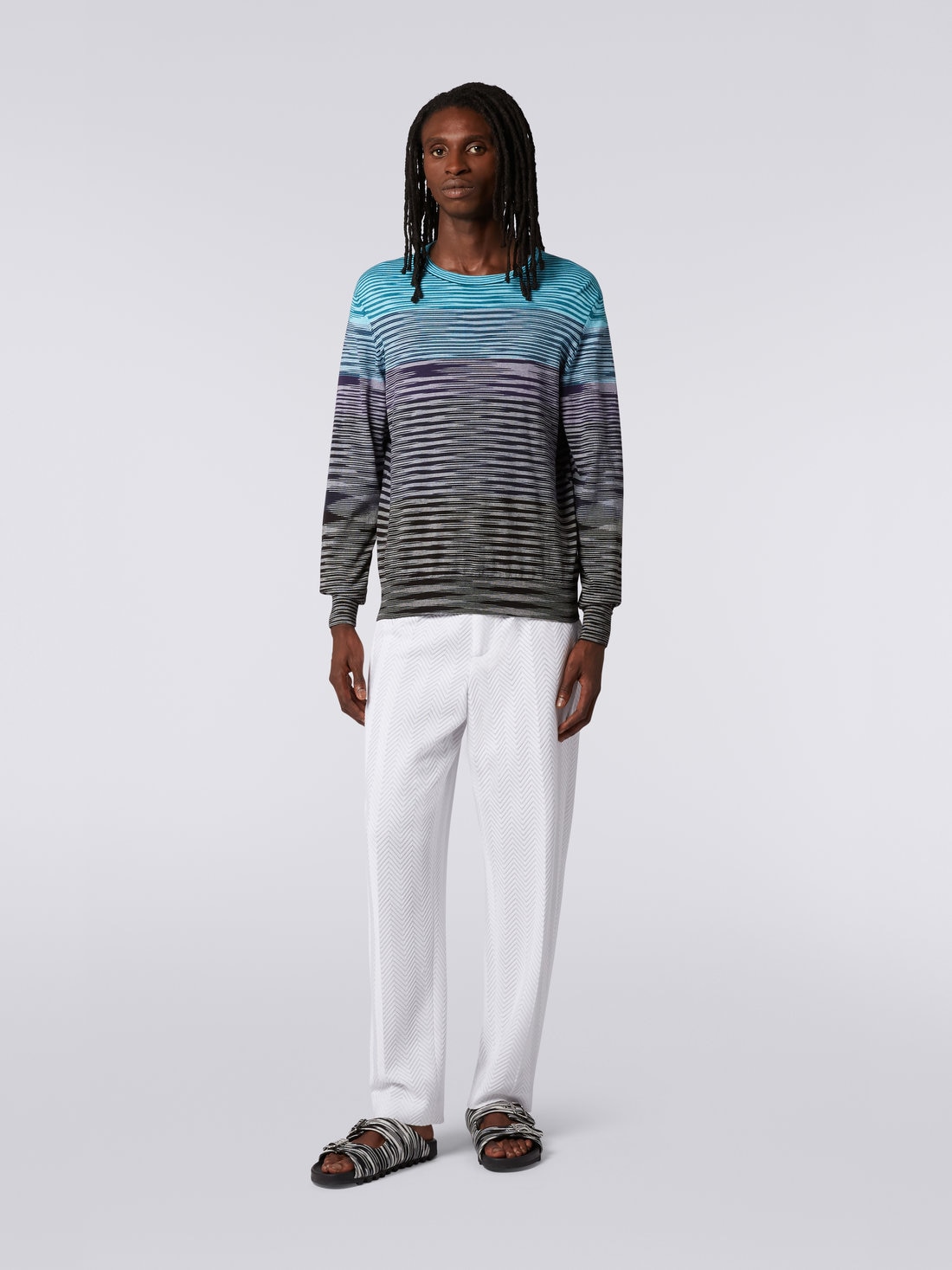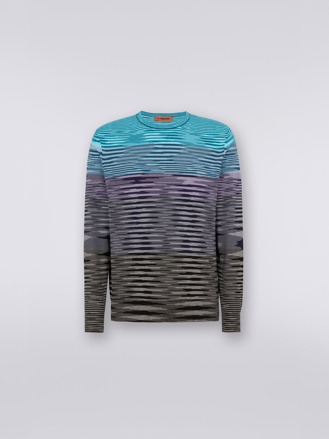 Il motivo fiammato, che tanto ha contribuito alla riconoscibilità di Missoni, è il protagonista assoluto del pullover girocollo da uomo. Realizzato in maglia di misto cotone, il modello sfrutta il potere del colore per animarsi di righe dégradé che lo percorrono orizzontalmente.