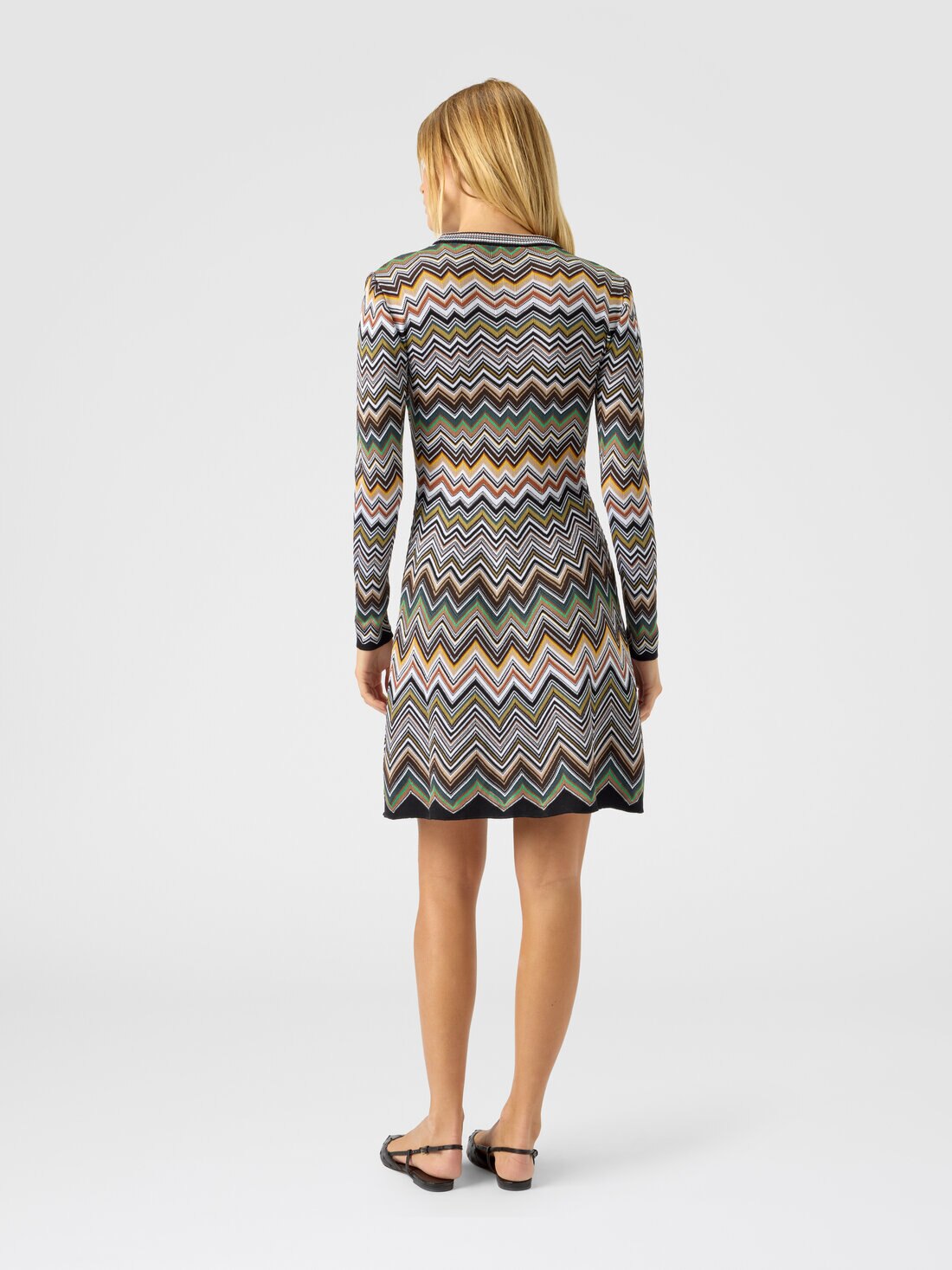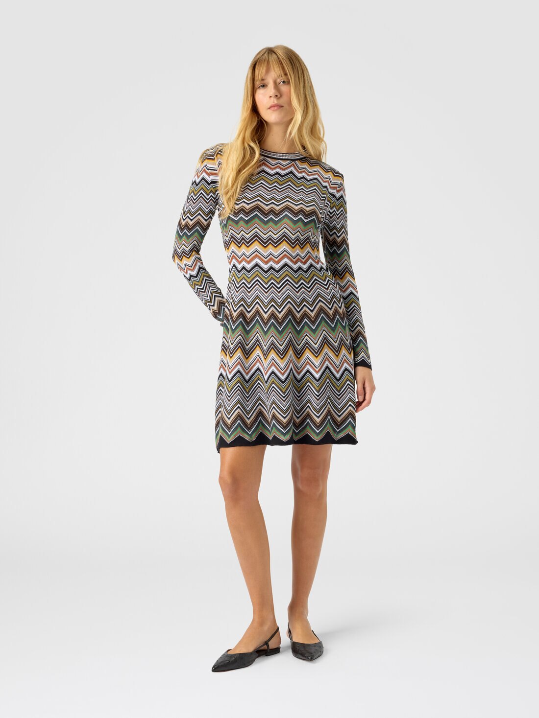 L’inconfondibile zig zag Missoni si rinnova in questo mini-abito da donna con girocollo e maniche lunghe, realizzato in misto viscosa e lana. Il motivo percorre il tessuto con ritmo e movimento, esaltando la femminilità attraverso un equilibrio di eleganza e modernità.