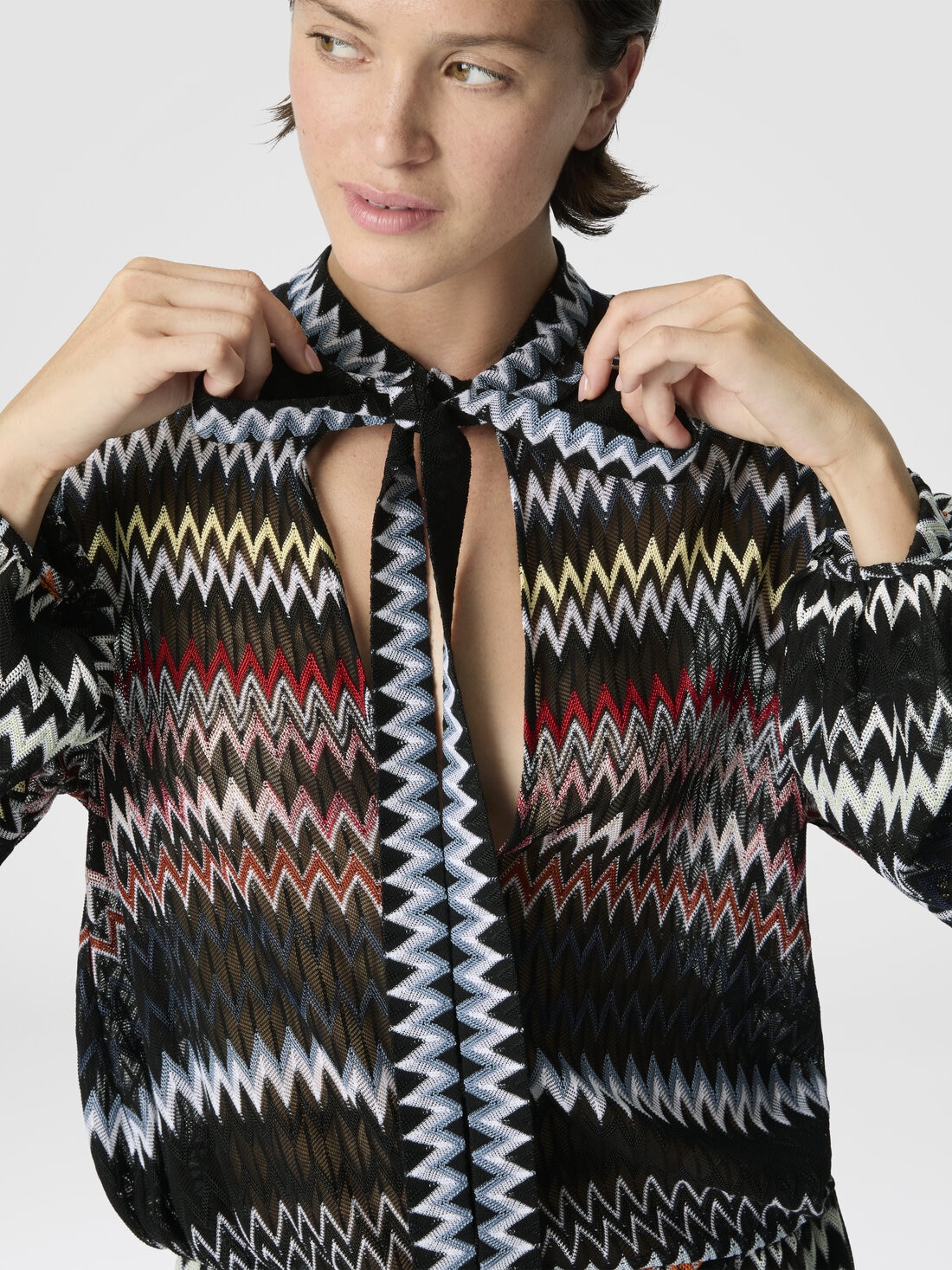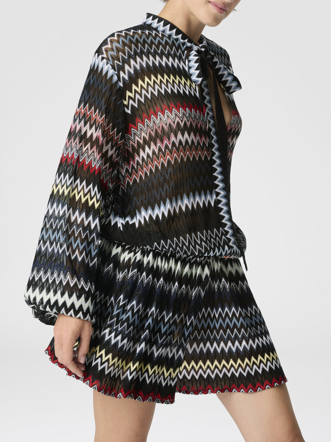 Un mini-abito da donna che gioca con volumi e dettagli grafici, firmato Missoni. Il profondo scollo a V è valorizzato da un delicato fiocco al collo, mentre la lavorazione raschel in micro chevron percorre il tessuto in misto cotone e viscosa, creando un raffinato gioco di linee e movimento. Un capo che unisce femminilità e ritmo in chiave contemporanea.