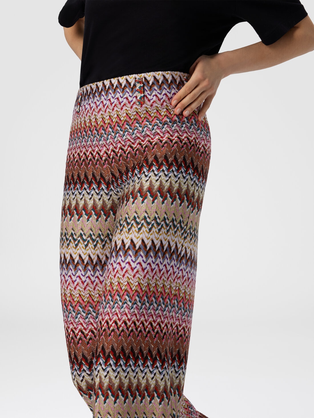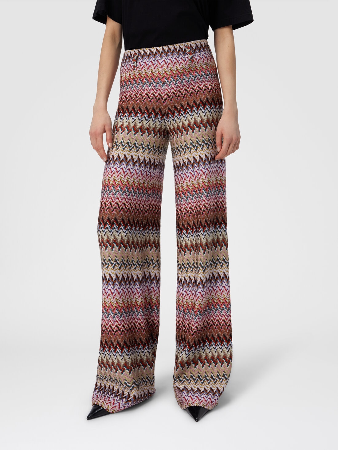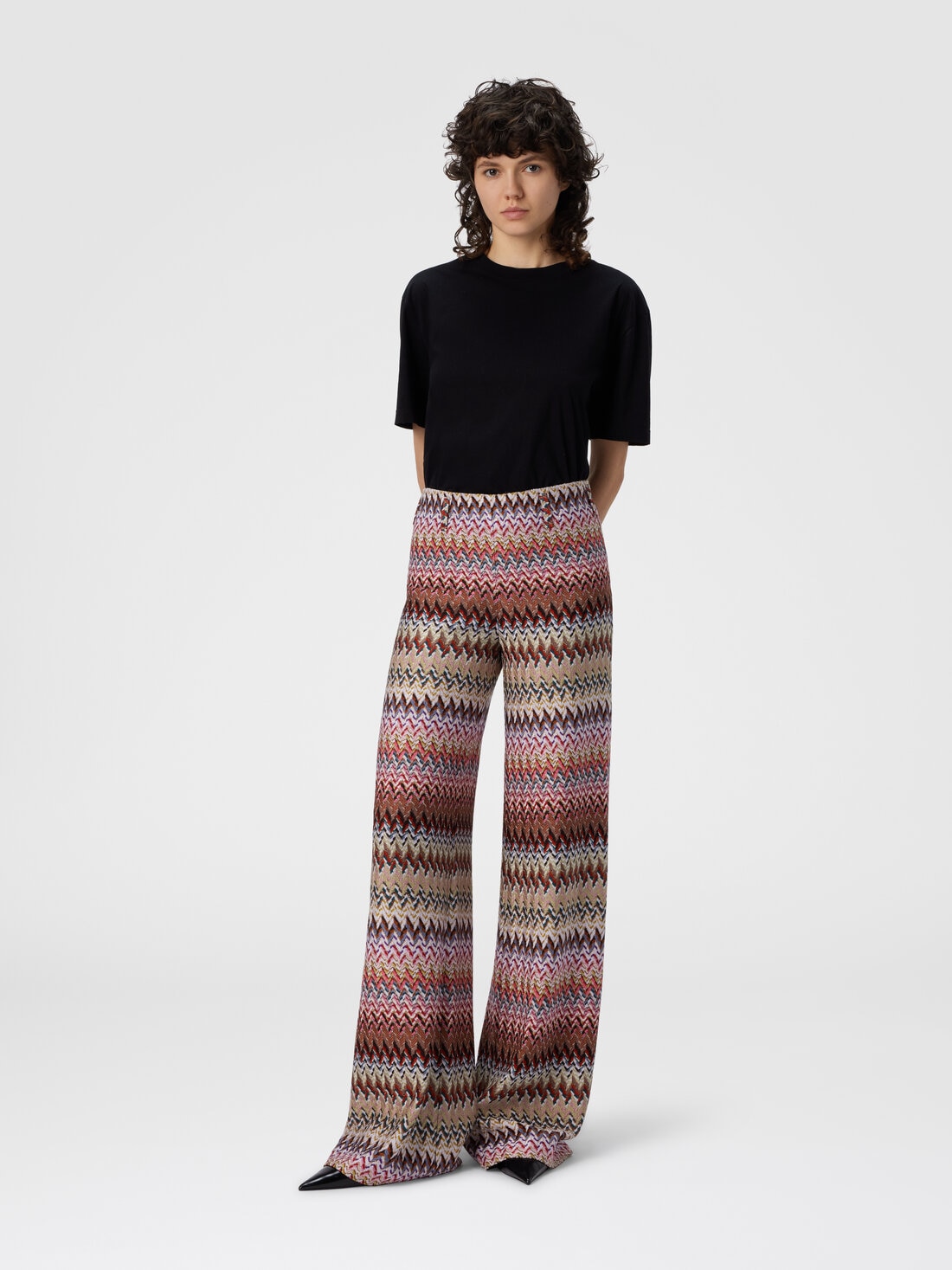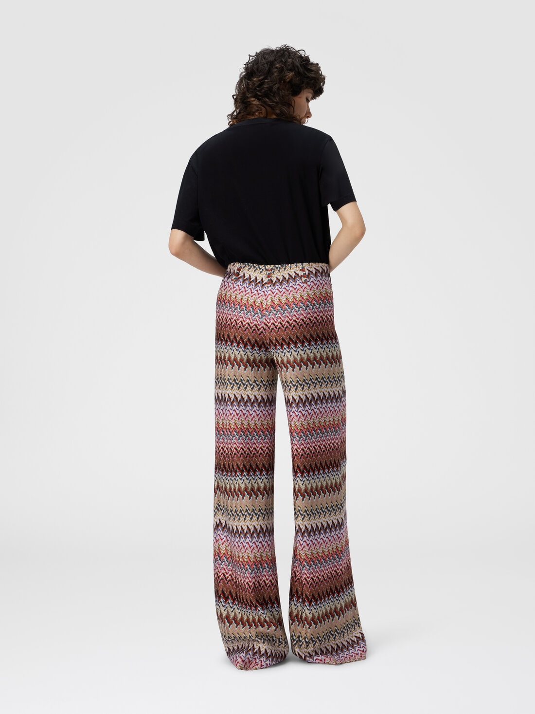 Un pantalone flare da donna che rilegge in chiave contemporanea l’iconico zig zag Missoni, proposto attraverso una raffinata lavorazione raschel. Realizzato in misto viscosa con filamenti lamé, combina movimento e brillantezza discreta, mentre la vita elasticizzata assicura una vestibilità versatile e femminile.