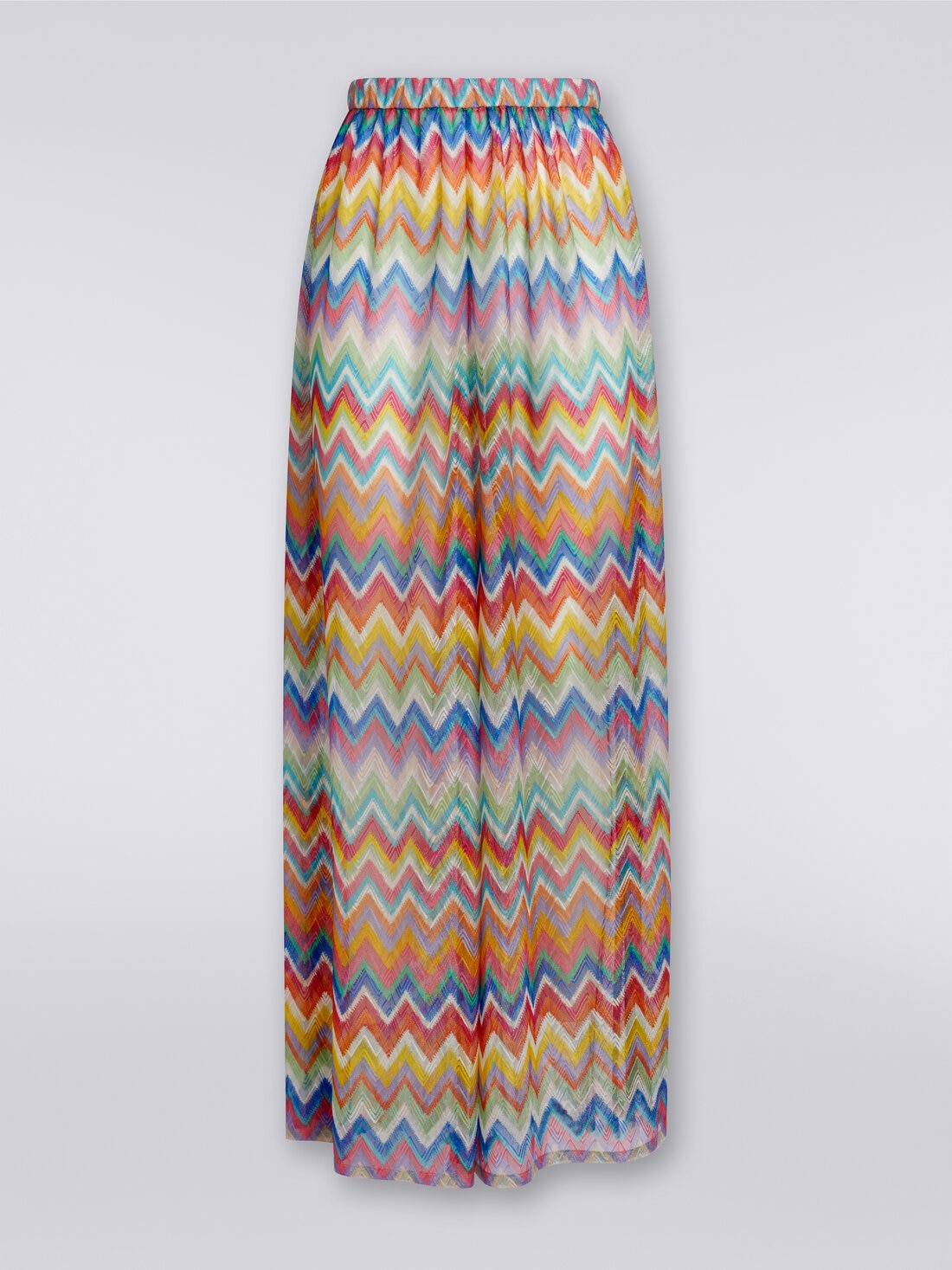 I pantaloni copricostume con stampa zig zag Missoni presentano elastico in vita che offre comfort e adattabilità al fit. Gli spacchi laterali aggiungono un tocco di sensualità al look, mentre le trasparenze giocano con la silhouette in modo elegante e intrigante.