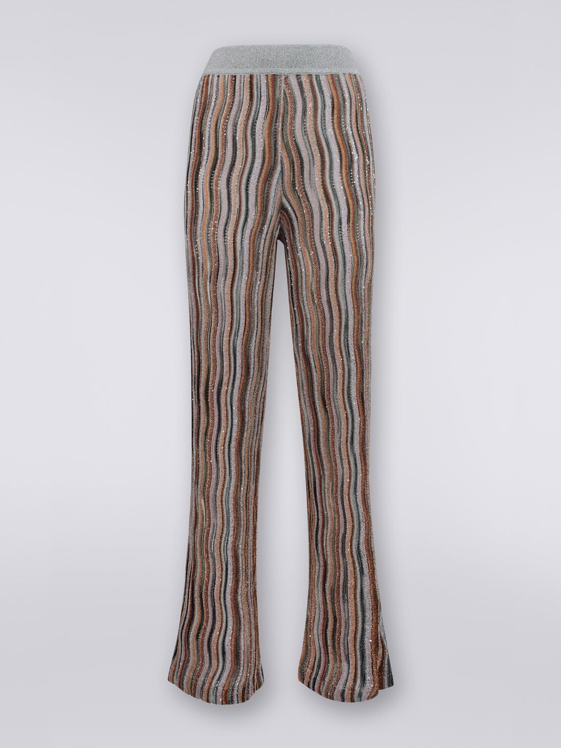 Con questi pantaloni lunghi da donna, Missoni aggiunge un tocco chic ai capisaldi del guardaroba. Realizzati in misto viscosa, sono caratterizzati dal motivo a onde costellato di lucenti lurex e paillettes.
