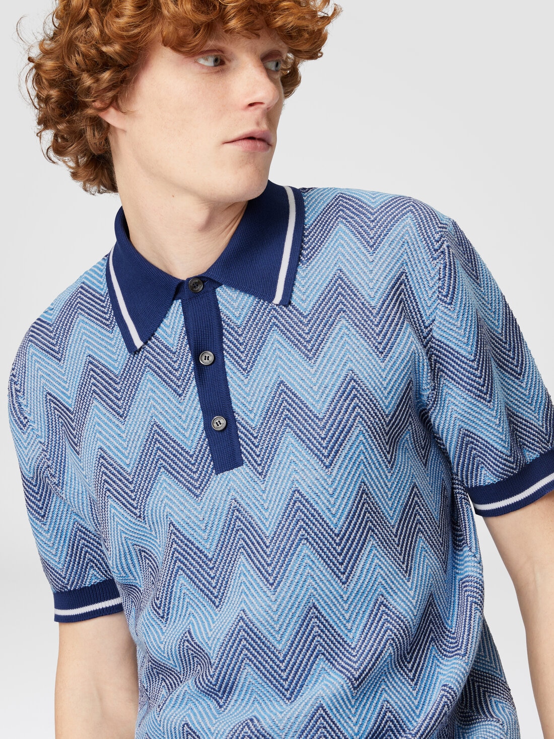 È una polo da uomo che interpreta con sicurezza il DNA Missoni quella realizzata in maglia di cotone con lavorazione chevron e motivo a zig zag. Il modello, con colletto e profili a contrasto, è il capo perfetto per accogliere la bella stagione che avanza.