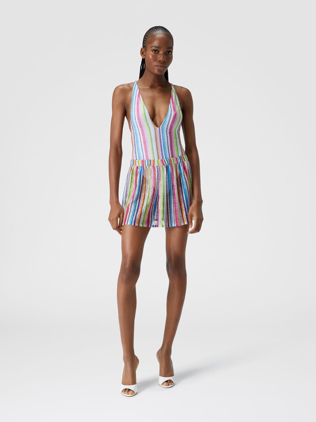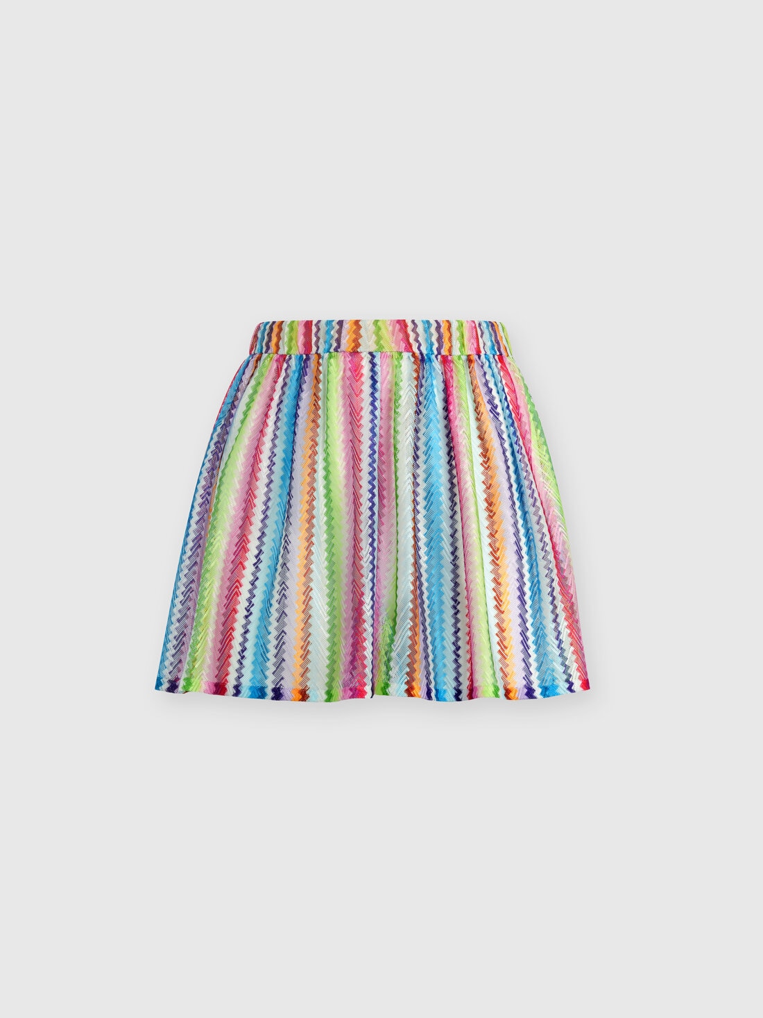 Giocano con le trasparenze del tessuto leggero, animato dalla lavorazione raschel con stampa zig zag verticale, gli shorts copricostume. Resi confortevoli dall'elastico in vita, sono la quintessenza dello stile Missoni da spiaggia.