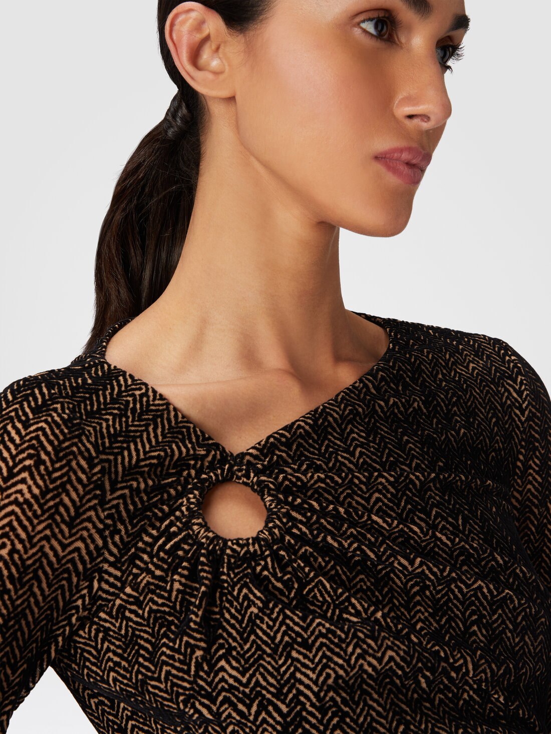 ギャザー付きのリングディテールで強調されたネックラインは、ジグザグの植毛プリントが施されたチュールのミニドレスを豊かにします。ストレッチ素材を使用したこのウェアは、シェブロンの新しい解釈でシルエットを強調しています。
