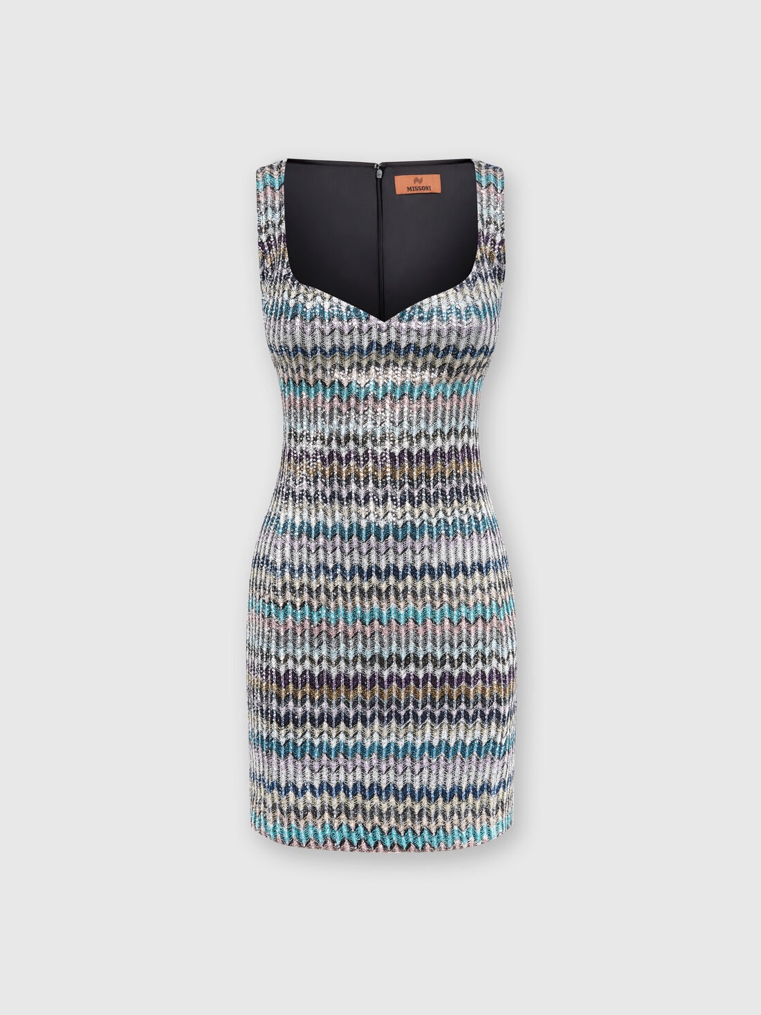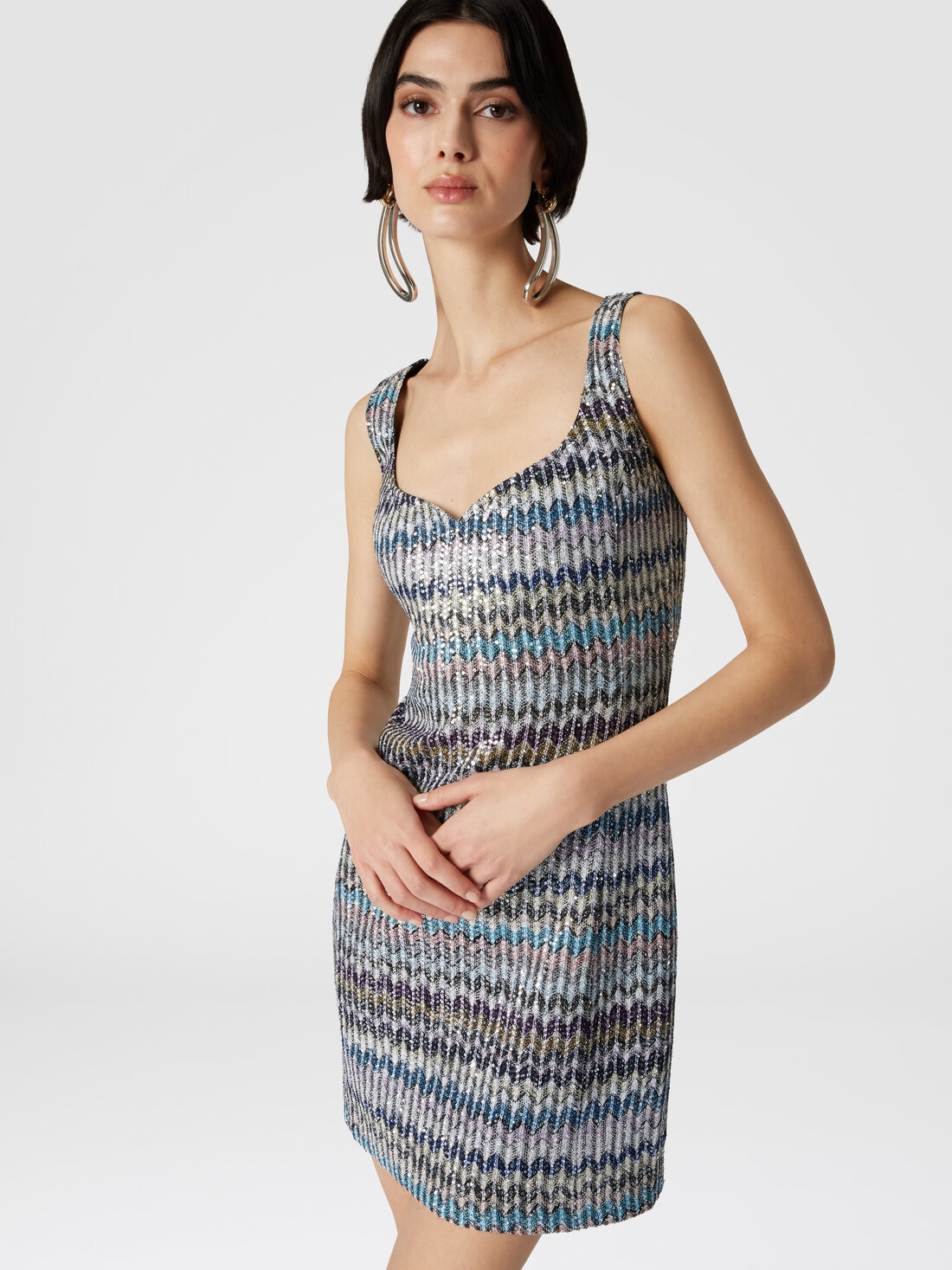 カペルドーニ織機で作られた織りは、スウィートハートネックラインのミニドレスです。スパンコールで飾られたジグザグのモチーフは、純粋なミッソーニスタイルで、明るさと紛れもない高級感を獲得しています。