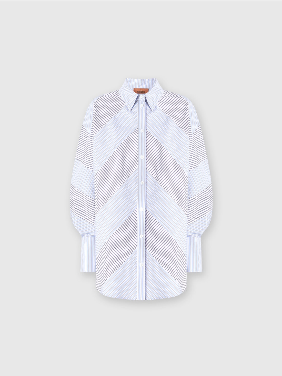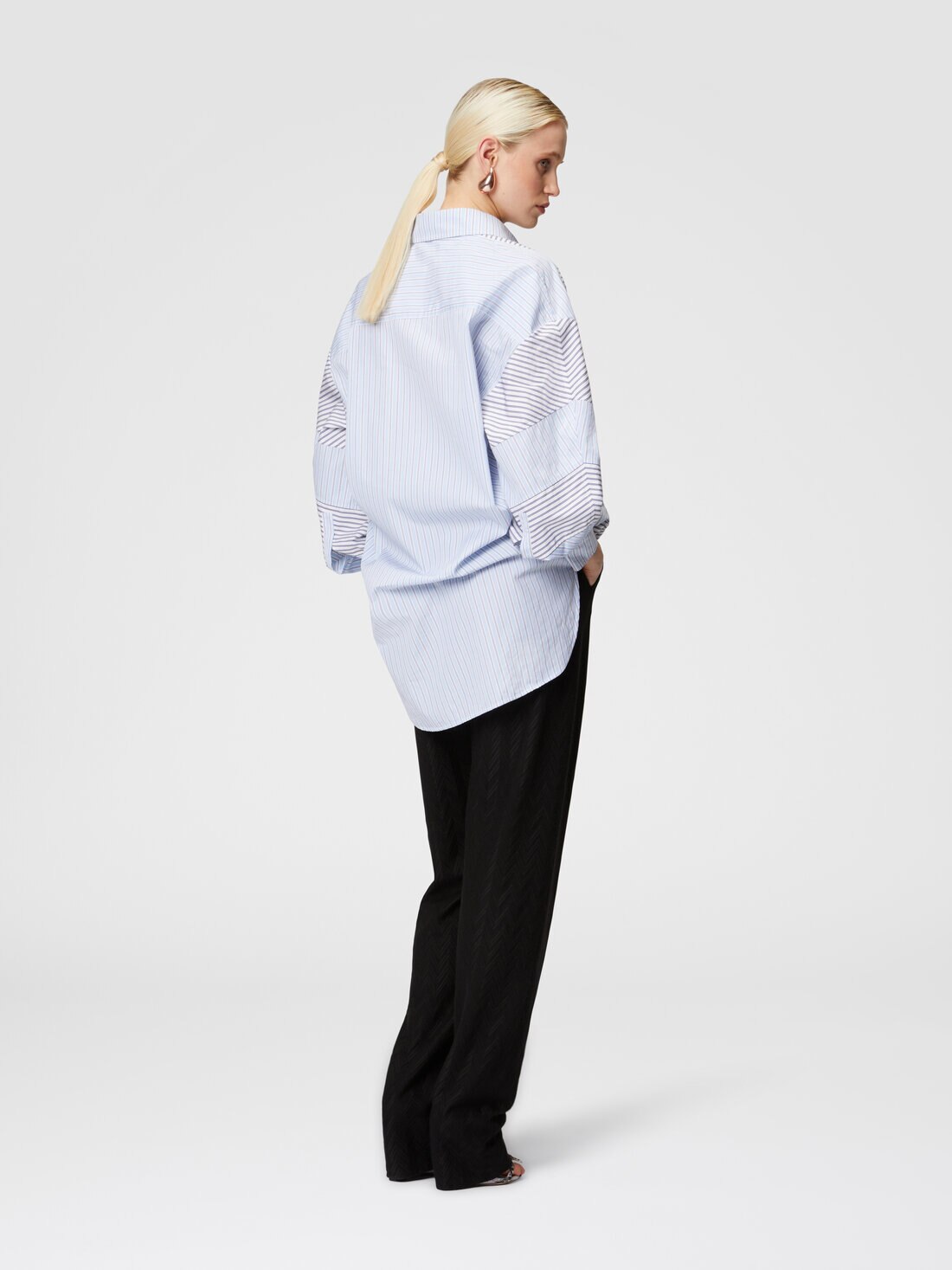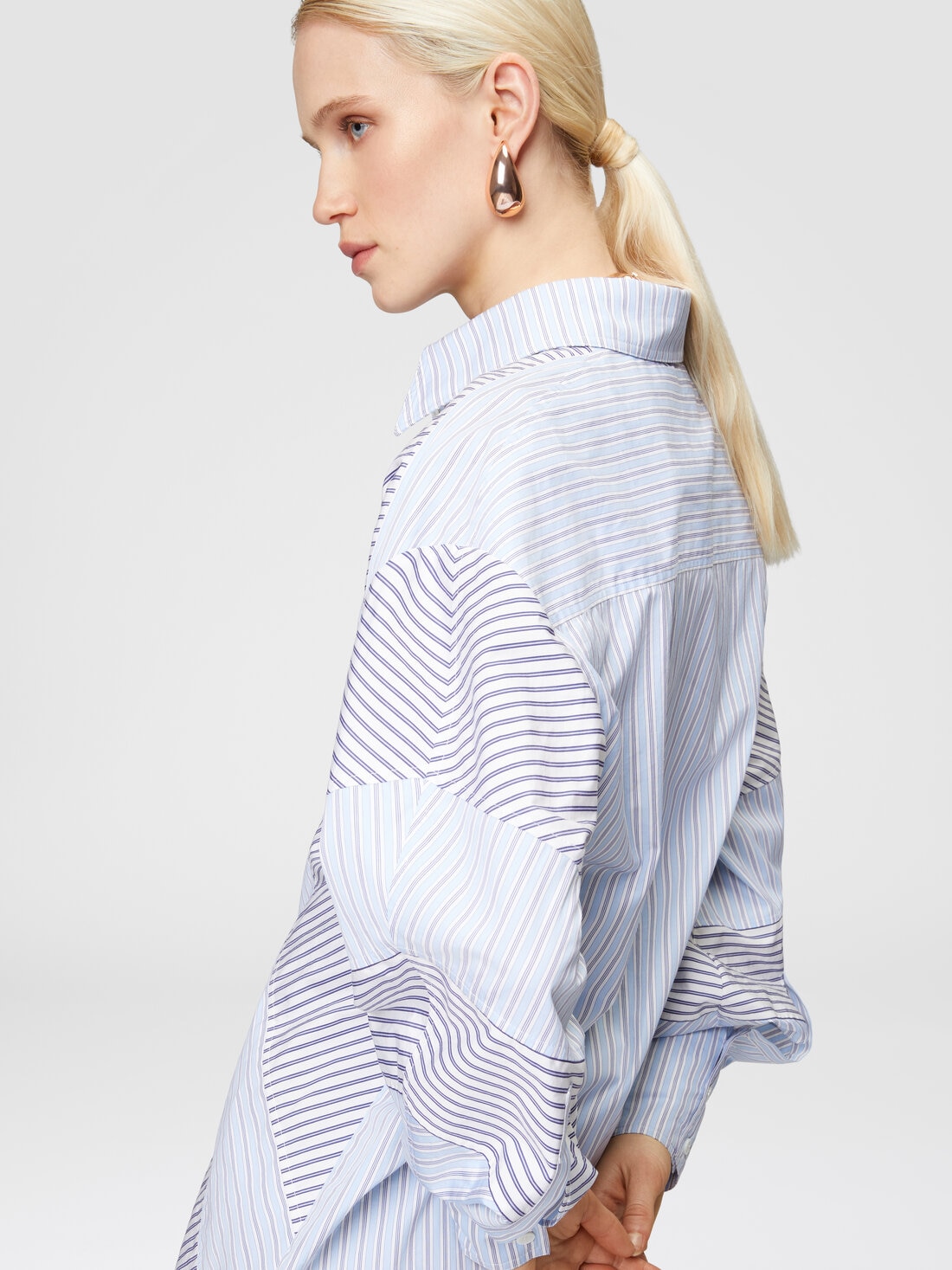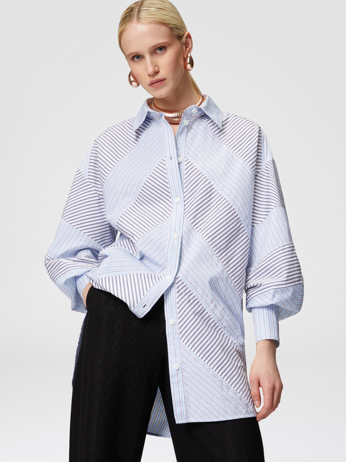 オーバーサイズのフィット感とワイドスリーブは、コットンポプリンシャツのルールを書き換えます。ストライプのモチーフを並べた新モデルは、クラシックを華やかにリメイクしています